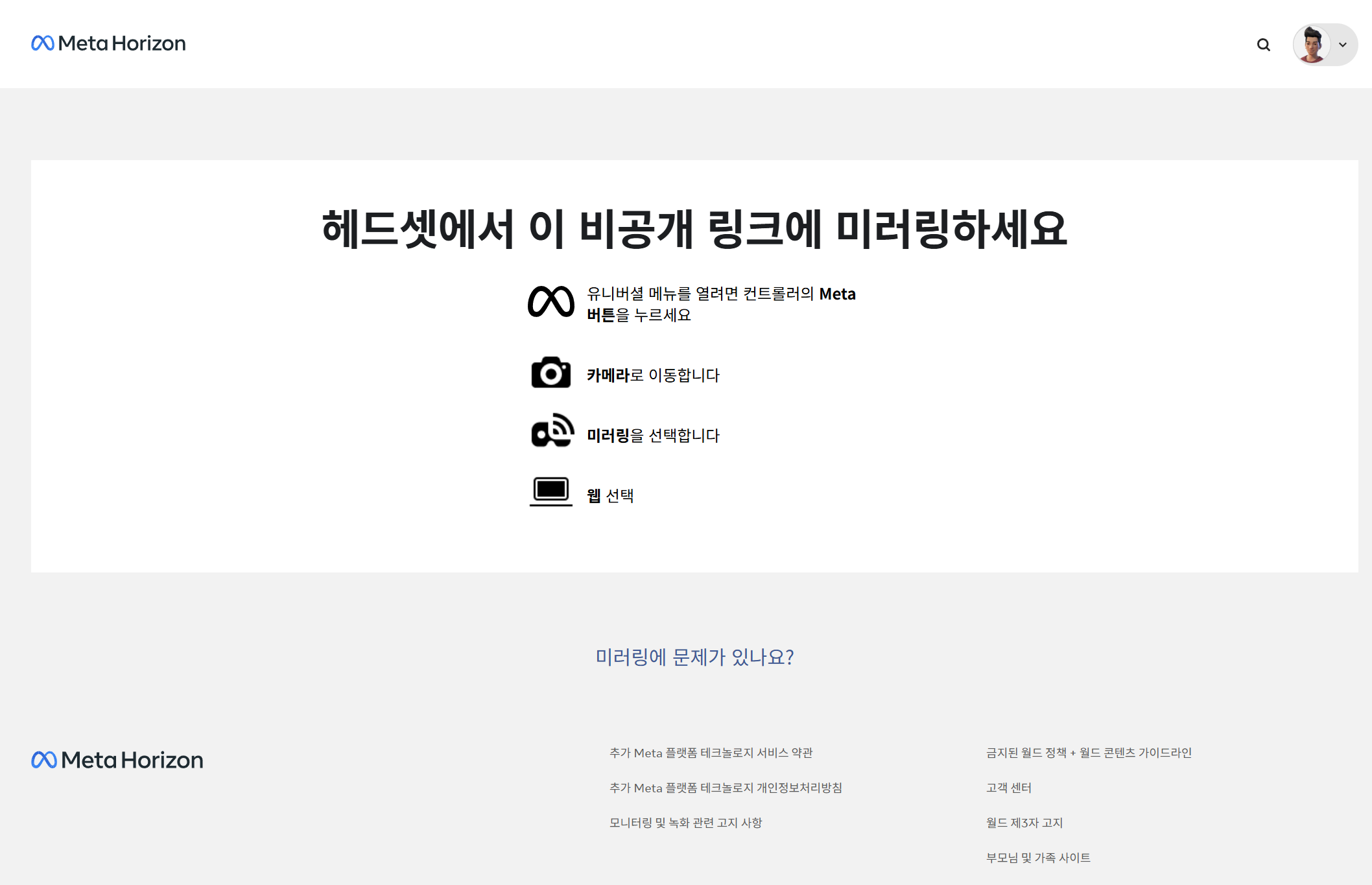 3)아래 horizon.meta 웹사이트에서 접속하여 페이지 새로고침하면 헤드셋의 디스플레이를 표시하는것을 확인할수있습니다.