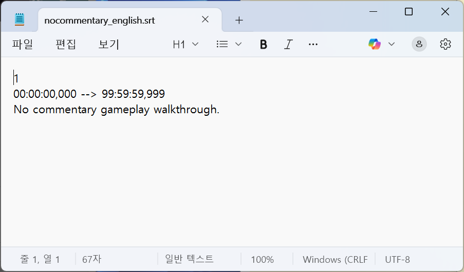 동영상 시작부터 끝까지 동일한 텍스트를 자막으로 표시하는 srt 파일 예시
