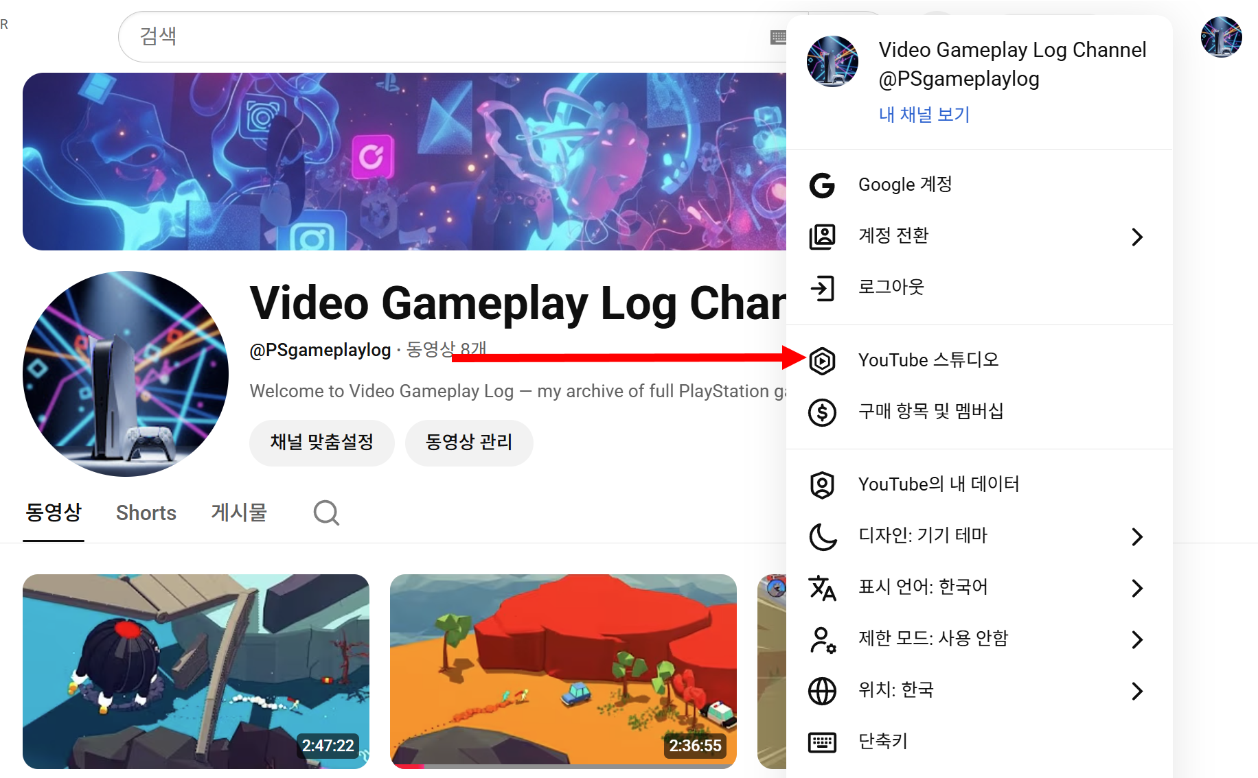 1)유튜브 채널에서 유튜브 스튜디오로 이동합니다(Youtube studio)