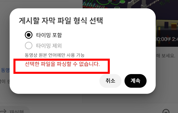 12)만약 선택한 파일을 파싱할수없습니다' 문구를 표시하면 업로드하는 자막 파일의 형식 및 포맷이 올바른지 확인하고 다시 업로드합니다.