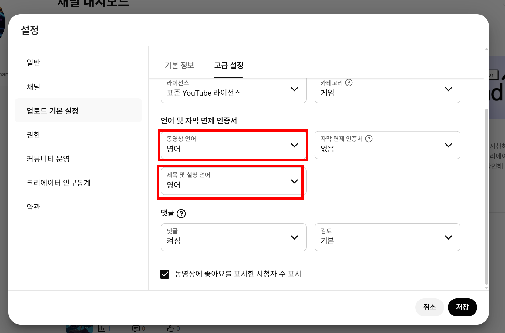 5)동영상 언어와 제목 및 설명언어를 영어로 변경합니다. 이후에 업로드하는 동영상의 언어와 제목 및 설명언어는 기본적으로 영어로 설정됩니다.
