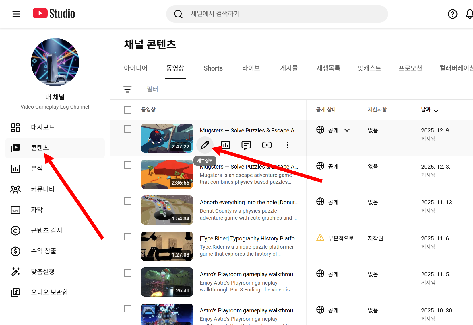 6)유튜브 스튜디오의 좌측 콘텐츠 메뉴에서 업로드한 동영상의 세부정보로 이동합니다.