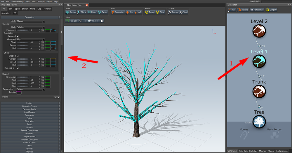 1)속성(properties)에서 나무를 수정할수있습니다. generation에서 generator를 선택하면 해당오브젝트를 수정할수있는 그룹들이 속성에 나타납니다. 가지(level1)를 선택하면 좌측의 속성(properties)에 가지를 수정할수있는 속성 그룹들을 표시합니다.