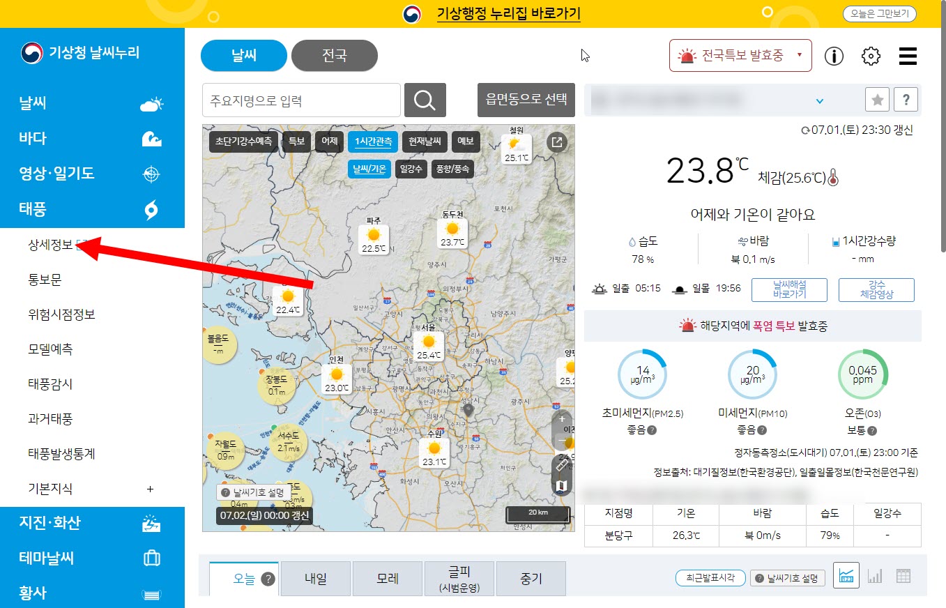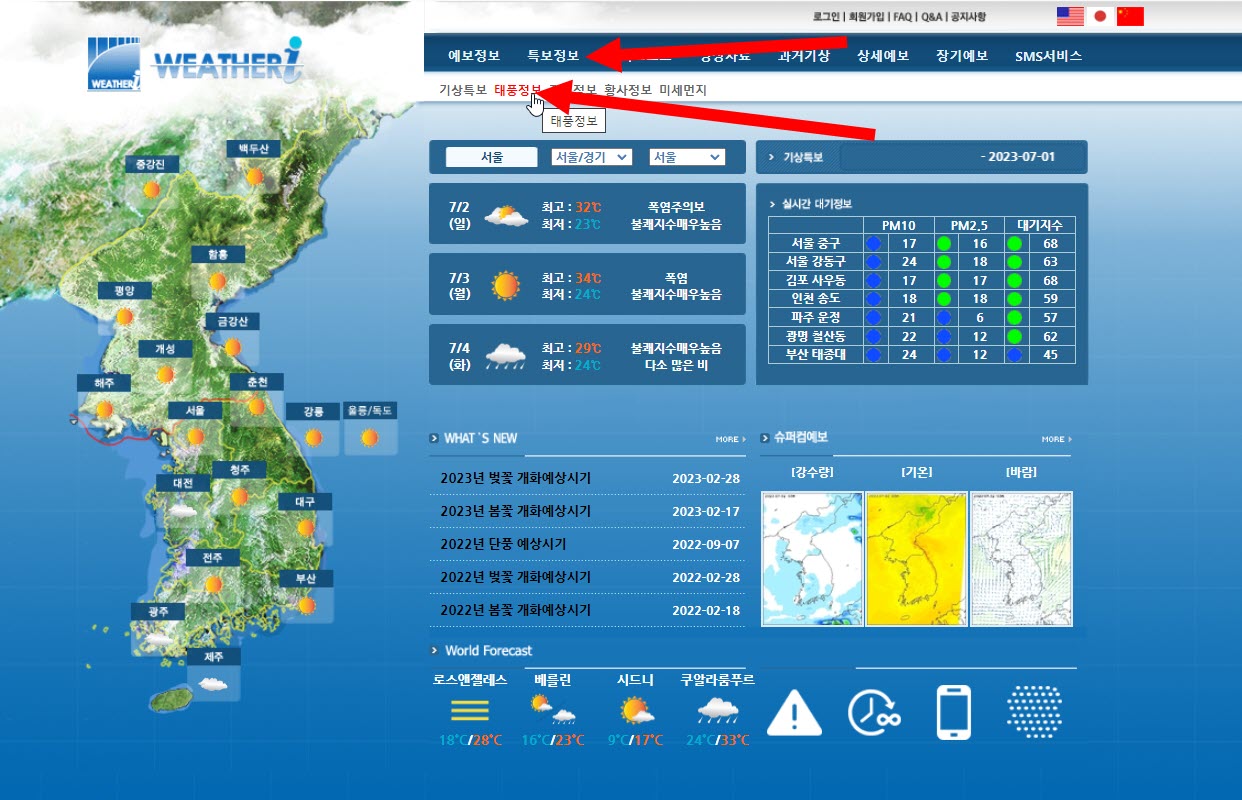 기상청 홈페이지의 태풍 메뉴에서 태풍 관련 정보를 확인할 수 있습니다.