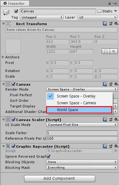 2)캔버스의 render mode를 world space로 변경한다.