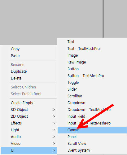 1)씬에 canvas 오브젝트를 생성한다.