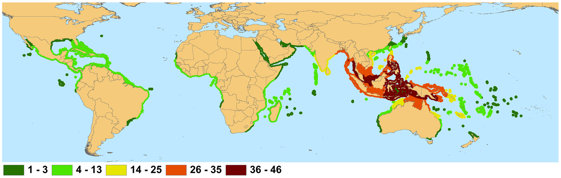 맹그로브 숲은 전 세계적으로 열대 및 아열대 지역, 주로 적도 근처의 해안선, 해변 및 강의 하구, 기수역 (brackish water)등에서 발견됩니다.