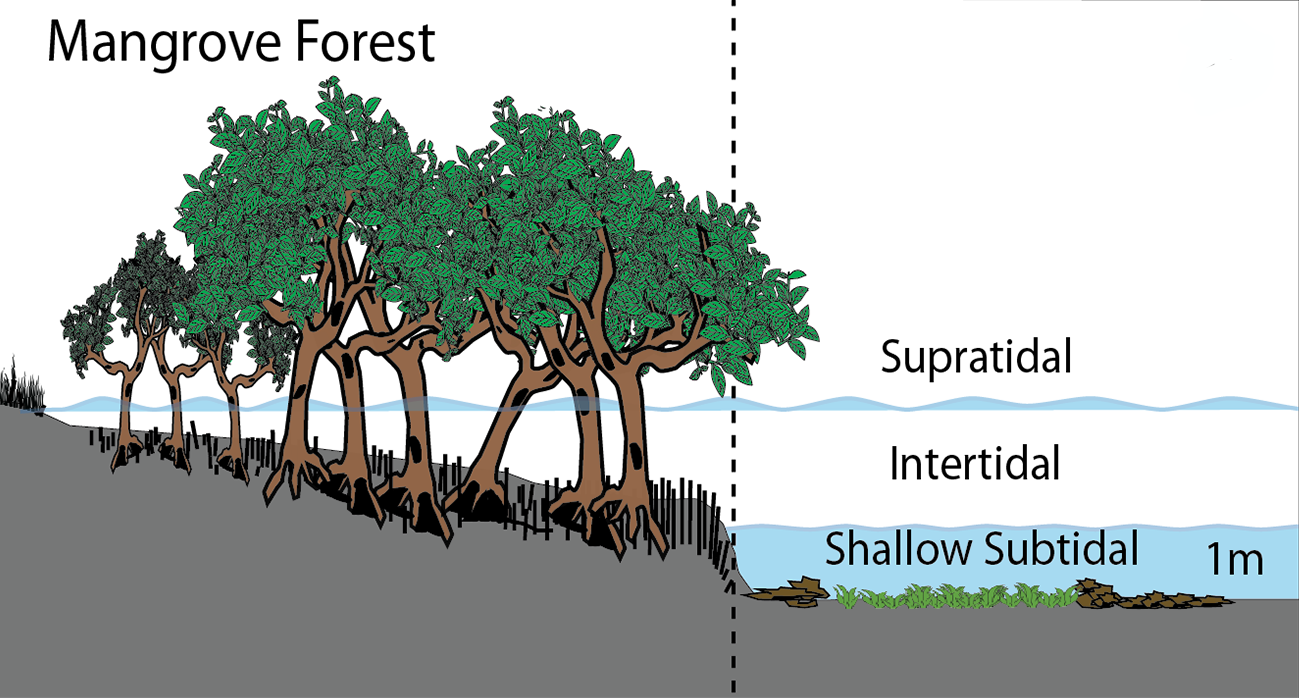 맹그로브로 구성된 맹그로브 숲은 밀물때에 잠기고 썰물때에 드러나는 간석지의 성격을 가지고있습니다. 염성 습지에 발달하는 관목(shrub), 작은 교목(small tree)을 포함한 다양한 종류의 맹그로브 나무 종 - 홍수과(Rhizophoraceae), 마편초과(Verbenaceae), 손네라티아과(Sonneratiaceae), 기타종과 함께 수많은 해양 생물, 민물 생물, 저서 생물 등 다양한 생물종이 서식합니다(어류, 조류, 양서류, 파충류, 포유류, 갑각류, 기타) 또 육지와 해양 환경의 경계 지역에 위치하므로 육지와 해양 생태계를 연결하는 중간 지대 역할을 합니다(강과 해양의 생태계 간 상호작용 촉진)
