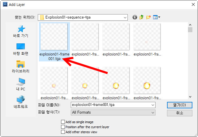 3)플레이어에 추가할 시퀀스의 이미지를 선택하고 열기한다.