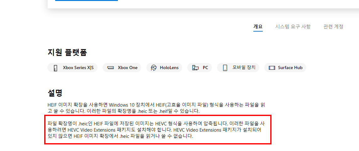 4)일반적으로 HEIF Image Extensions를 설치하면 윈도우10에서 HEIF 형식을 사용하는 파일을 읽기 및 쓰기 가능하다. 하지만 HEIC 형식을 읽기 및 쓰기 가능하기 위해서는 추가 패키지를 설치해야한다.