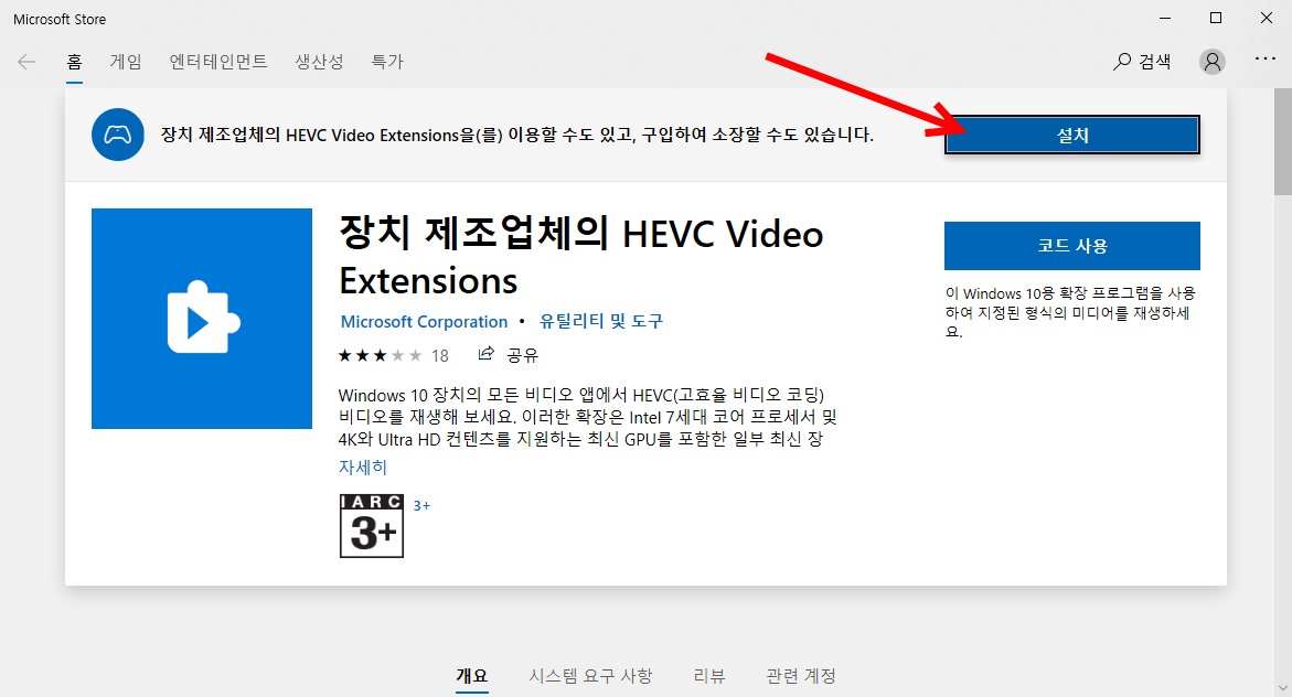 5)아래 마이크로소프트 스토어에서 HEVC Video Extensions 패키지를 설치한다.