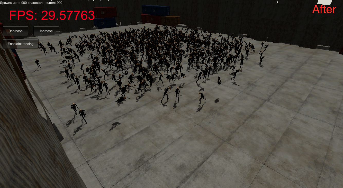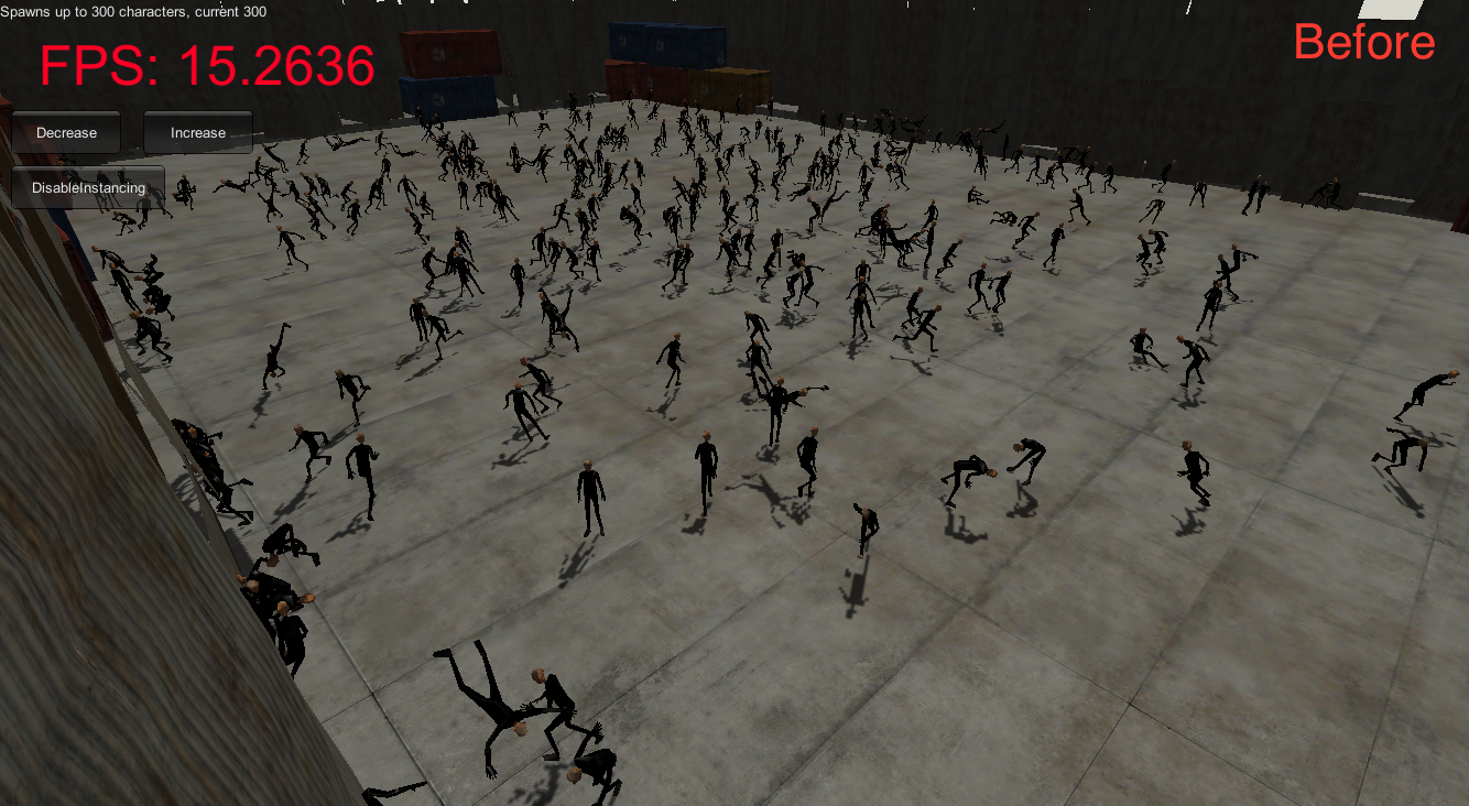 하지만 캐릭터등의 SkinnedMeshRenderer 오브젝트는 스키닝(skinning)이 CPU에서 계산되고 하나씩 GPU로 제출되기때문에 일반적인 방법으로 인스턴싱을 사용할수없다. 만약 씬에 수많은 캐릭터가 존재한다면 그것은 막대한 양의 애니메이션 계산과 함께 높은 드로우콜 수치를 초래할것이다.