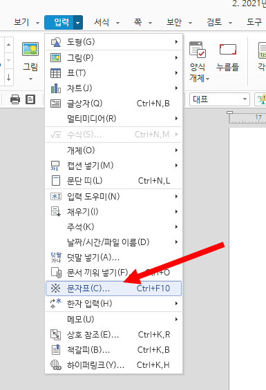 3)상단의 입력메뉴에서 문자표로 이동한다(ctrl+f10)