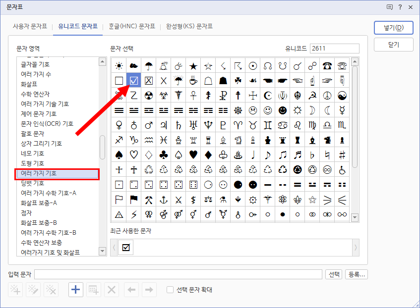 4)유니코드 문자표에서 여러가지 기호의 체크박스를 선택하고 넣기를 클릭한다.