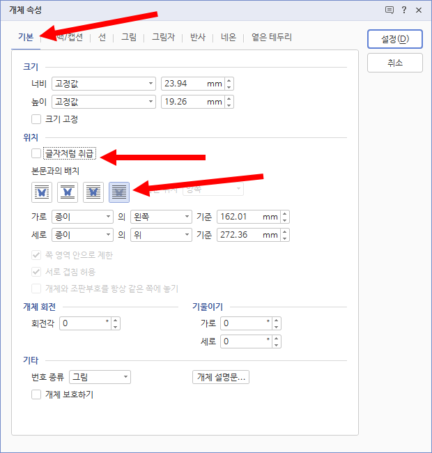 7)개체 속성의 기본에서 글자처럼 취급을 선택해제한다. 본문과의 배치에서 글 뒤로를 선택한다.