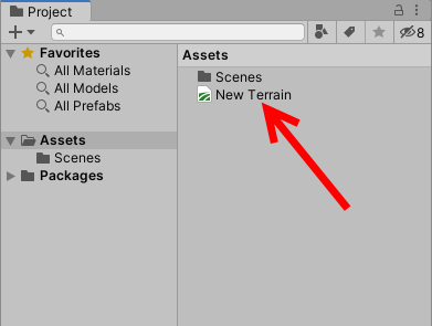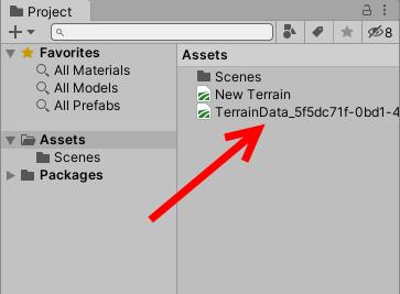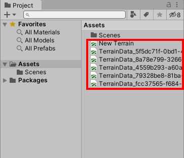 3)터레인을 생성하면 터레인 에셋 데이터도 함께 생성한다. 터레인 게임오브젝트는 터레인 데이터를 참조하며 이것은 프로젝트의 에셋 폴더에서 확인할수있다.