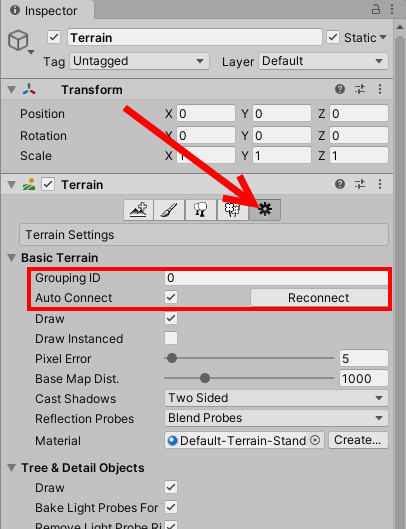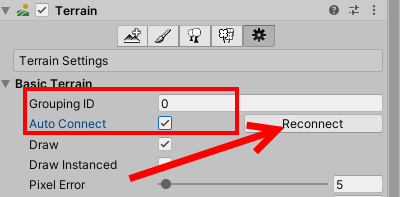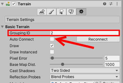 9)Grouping ID에 다른 값을 입력하고 auto connect를 체크 해제하면 해당 터레인은 기존의 ID를 사용하는 터레인 그룹과 구별된다.