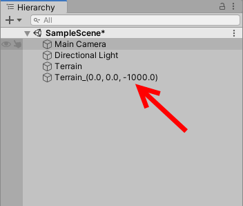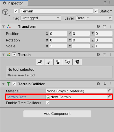 6)씬에서 추가된 터레인을 확인할수있으며 해당 터레인에 대한 터레인 데이터도 추가된것을 확인할수있다.