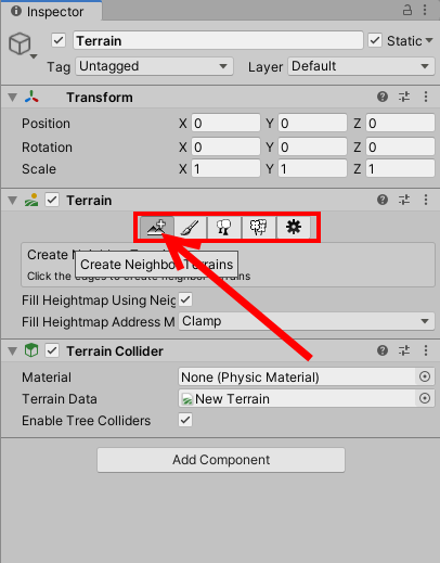 3)터레인을 확장하려면 터레인 도구 모음에서 create neighbor Terrains를 활성화한다.