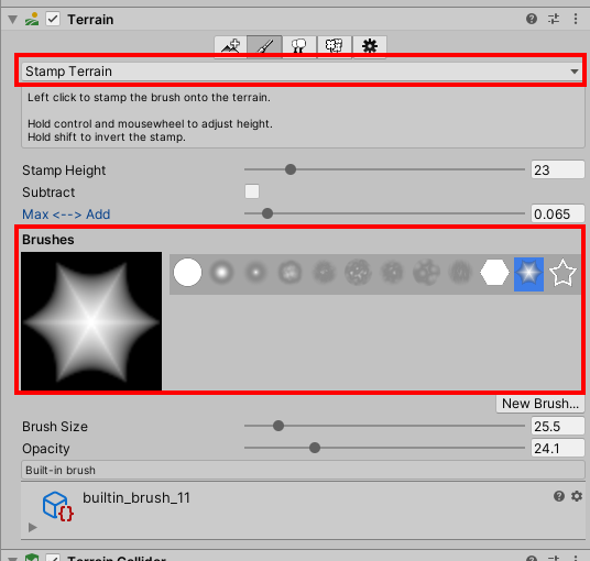 9)stamp terrain을 사용하여 터레인 위에 브러시 모양을 스탬프 처리할수있다.