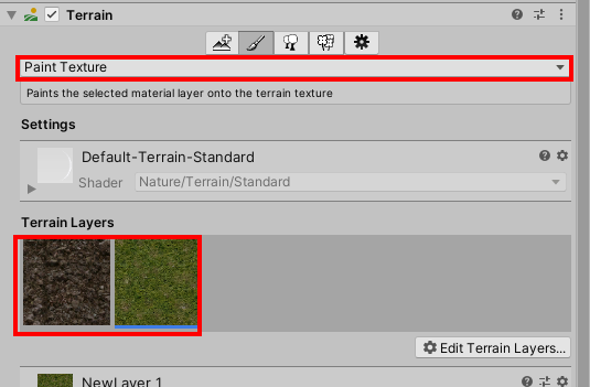 6)텍스처 페인트 도구(paint texture)를 사용하여 지형에 텍스처를 추가할수있다.