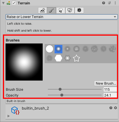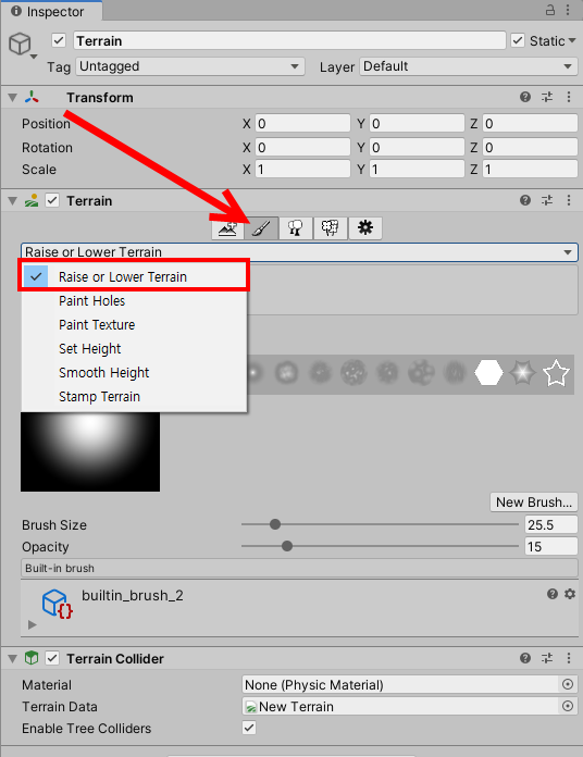 1)터레인 컴포넌트의 도구 모음에서 paint terrain 아이콘을 클릭하고 raise or lower terrain을 선택한다.