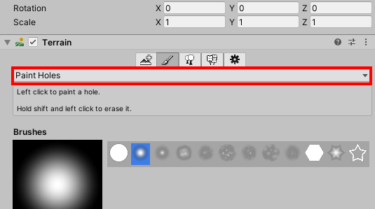 4)paint holes는 지형에 구멍을 생성한다(opening) 동굴, 절벽과 같은 구조물을 생성할때 사용할수있다.