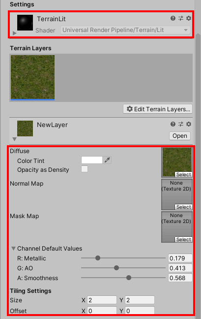 12)터레인 레이어는 터레인 세팅에서 설정한 재질 및 현재 사용중인 렌더파이프라인에 따라서 다른 옵션 및 속성을 표시한다.