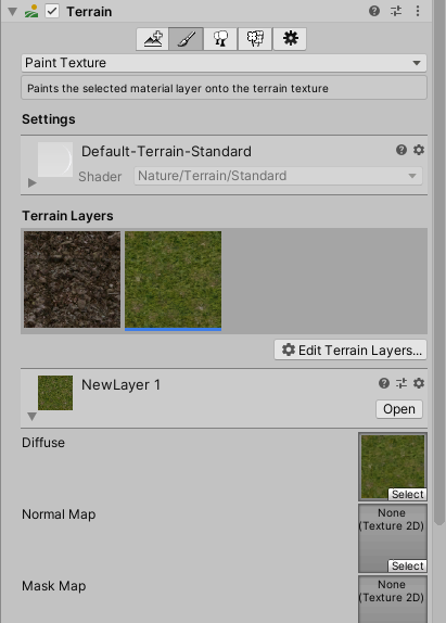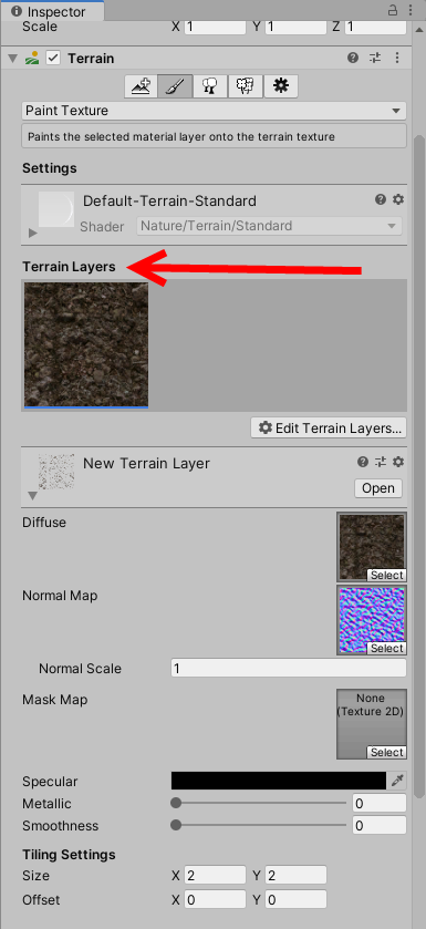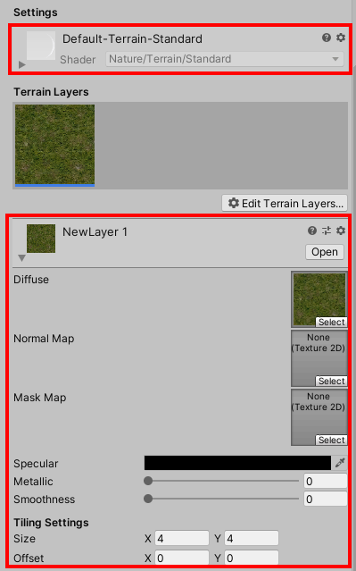 3)터레인 레이어를 설정한다. 페인트에 사용할 텍스처를 추가하고 재질의 속성(specular, metallic, smoothness), 타일링(tiling settings)을 설정한다.