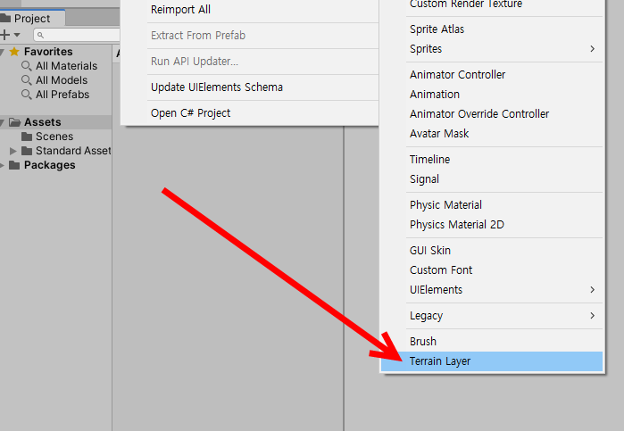 프로젝트 폴더에서 마우스 우클릭한후 create의 terrain layer를 선택한다.