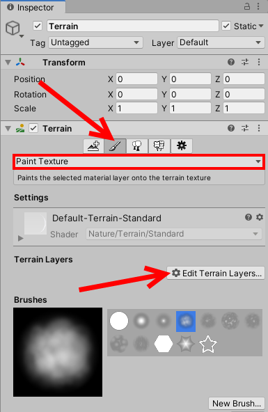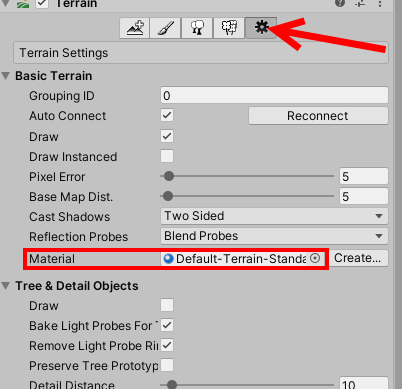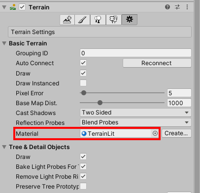 현재 기본 터레인 재질(default-terrain-standard)을 사용하고있는것을 확인할수있다(빌트인 렌더파이프라인)