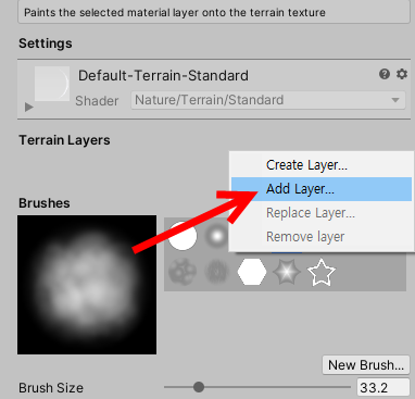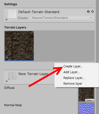 7)edit terrain layers를 클릭하고 create layer를 선택한다.
