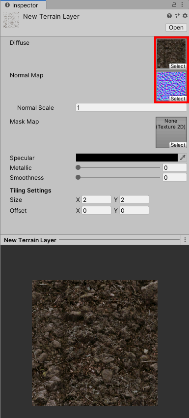 3)터레인 레이어를 설정한다. 페인트에 사용할 텍스처를 추가하고 재질의 속성(specular, metallic, smoothness), 타일링(tiling settings)을 설정한다.
