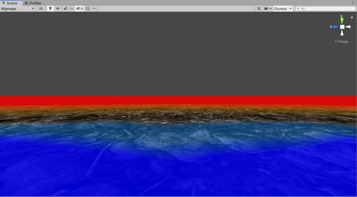 5)아래에서 빨간영역은 텍스처의 크기가 필요 이상으로 크다는 의미이고 만약 텍스처의 밉맵을 활성화하였다면 해당 영역은 원본 텍스처를 축소한 이미지들이 사용될것이다. 파란 영역은 텍스처의 크기가 작다는 의미이고 원본 텍스처 사이즈를 사용할것이다. 이 영역은 현재 사용중인 텍스처보다 큰 이미지를 사용한다면 화질의 개선이 있다. 두 색상의 중간 영역은 텍스처의 크기가 적절하다는 의미이고 원본 텍스처 사이즈를 사용할것이다.