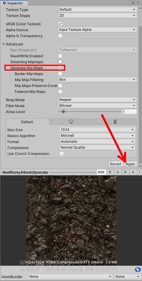 1)터레인에서 사용중인 텍스처에 밉맵을 설정한다. 텍스처 파일의 임포트 세팅(import settings)에서 generate mip maps에 체크하고 적용한다.