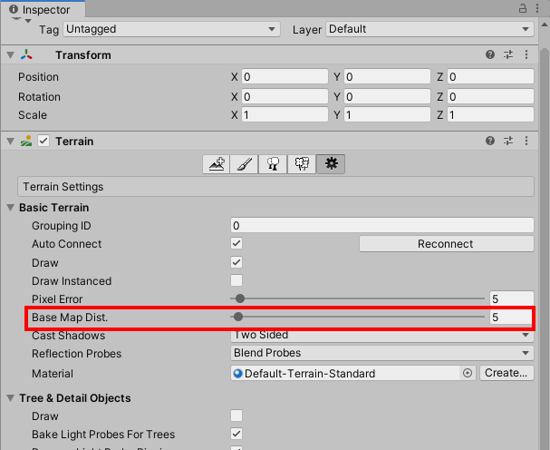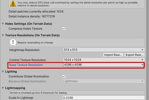 8)base texture resolution은 카메라와 터레인의 거리 값이 base map dist에서 설정한 값보다 커졌을때 터레인에 사용되는 합성 텍스처의 해상도이다.