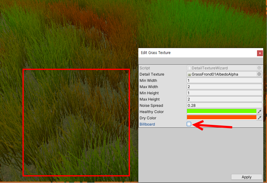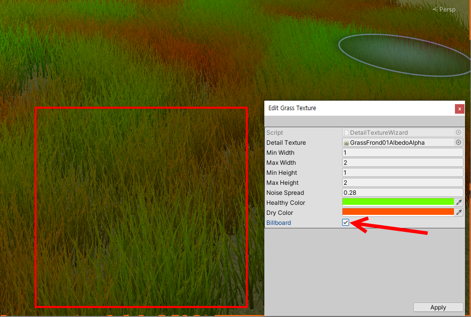 14)디테일 오브젝트에 빌보드를 사용하려면 billboard 속성에 체크한다.