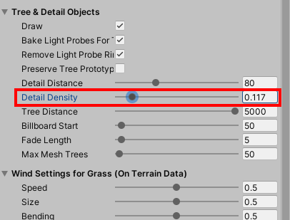 8)tree & detail objects의 detail density는 터레인에 존재하는 디테일의 밀도를 0부터 1사이의 값으로 조절한다.