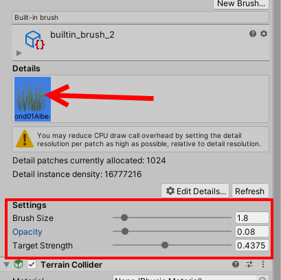 4)디테일을 선택하고 브러쉬의 속성을 설정한후 터레인에 추가한다.