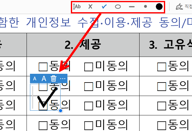 9)체크마크를 선택하고 문서에 클릭하여 추가한다(텍스트, 체크표시, 선 등의 채우기 도구를 제공한다)