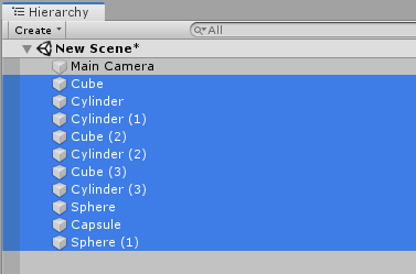 2)씬에 10개의 기본 오브젝트를 생성하고 동일한 재질을 할당하였다. 현재 프로젝트에서 배칭(static batching, dynamic batching)을 비활성화하였기때문에 동일한 재질을 사용하는 10개의 오브젝트에 대해 모두 드로우콜을 호출한다.(batches:11)