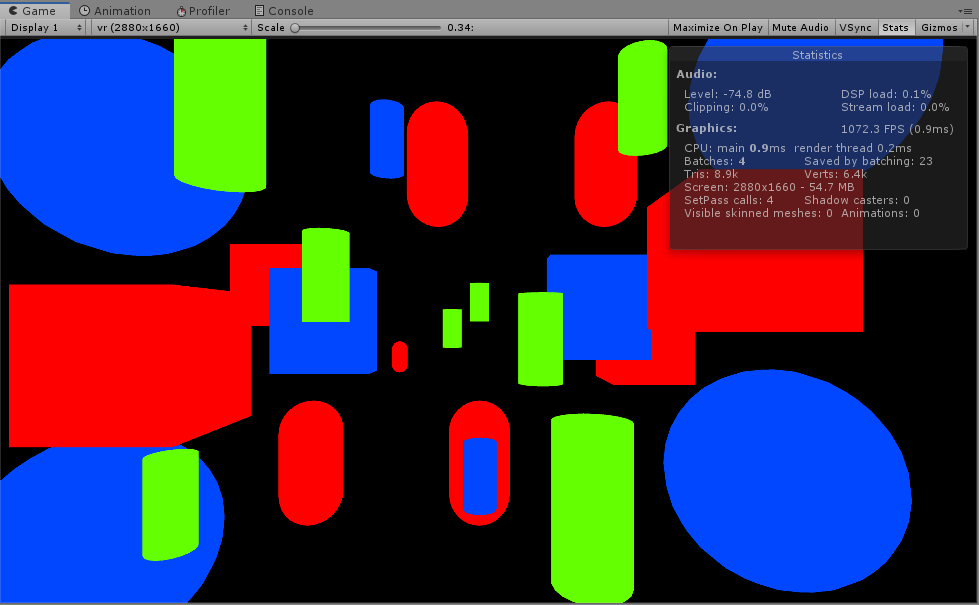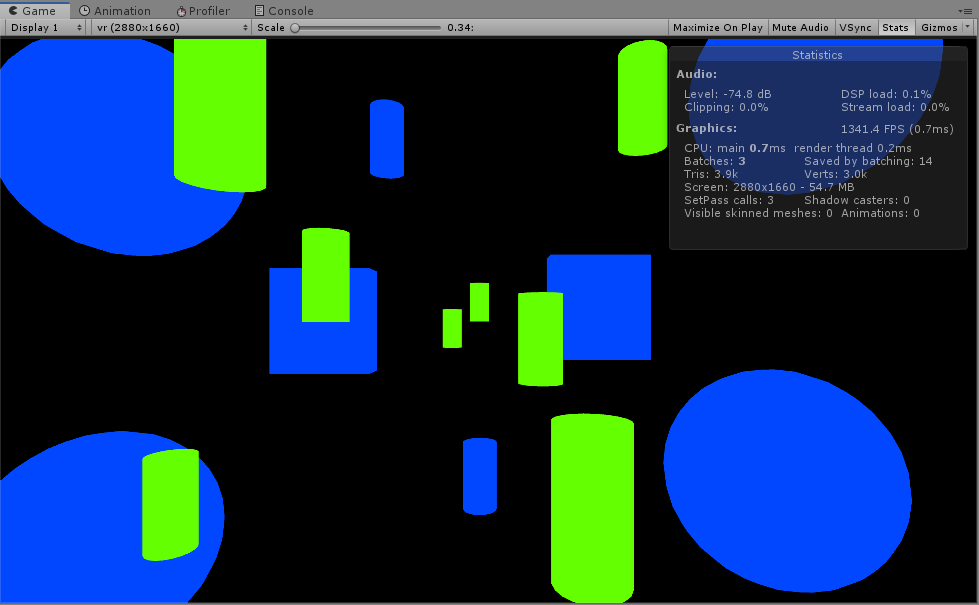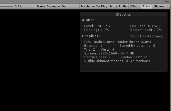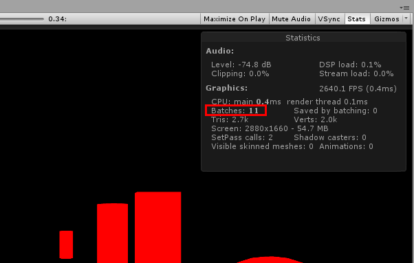 5)게임플레이 버튼을 클릭하여 씬을 로딩하면 변화를 확인할수있다. 모든 오브젝트가 동일한 재질을 공유하고있기 때문에 10개의 오브젝트를 일괄적으로 처리한다(batches:2)