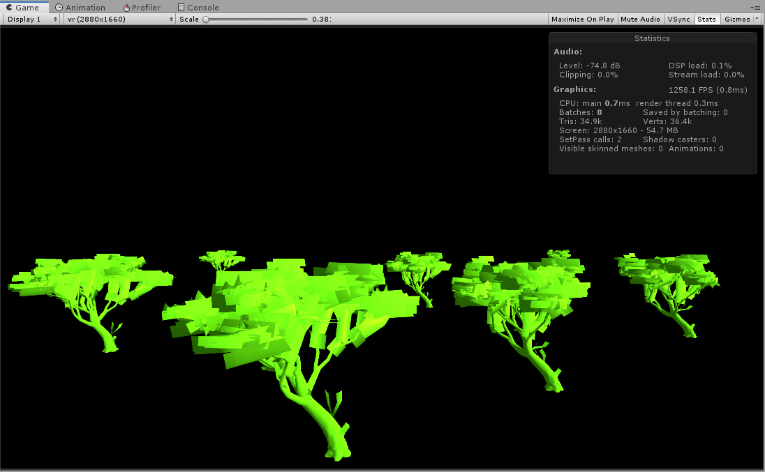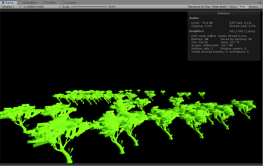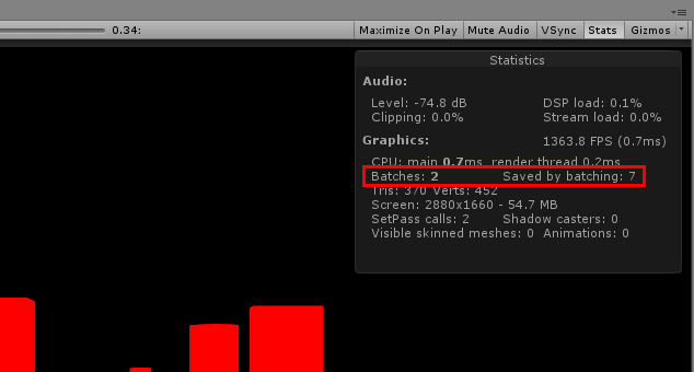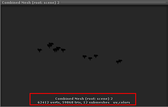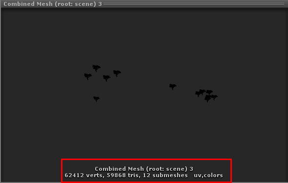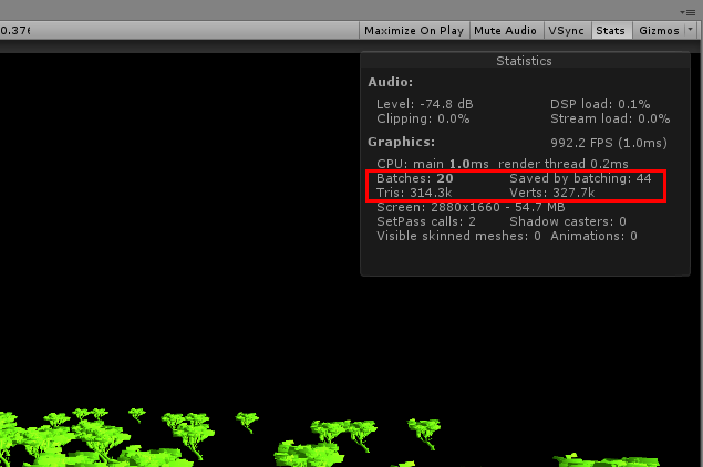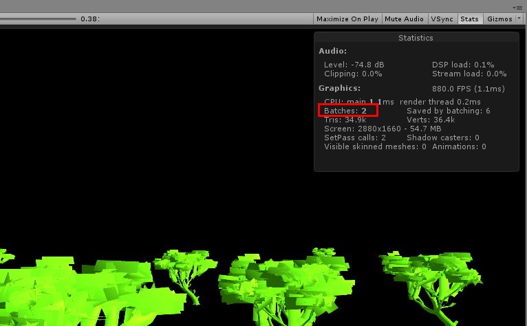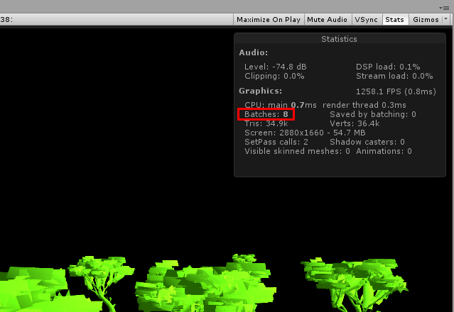 batches의 수치는 오브젝트의 개수와 동일하지만 모든 오브젝트가 한개의 나무 메시를 공유한다.