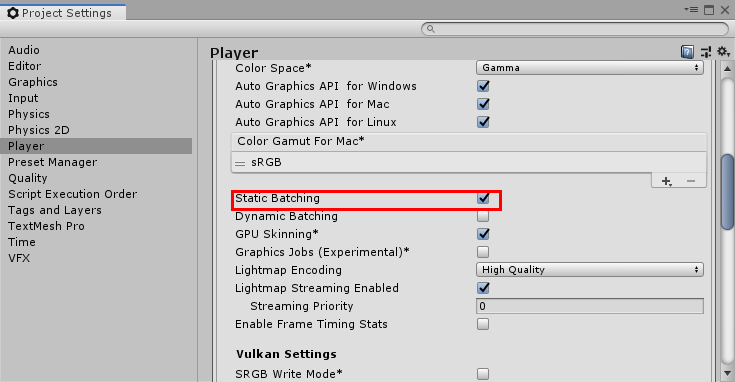 4)정적배칭을 활성화하려면 project settings에서 player의 static batching에 체크한다.