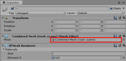 6)오브젝트의 mesh filter 컴포넌트에서 결합된 하나의 메시가 할당되어있는것을 확인할수있다(combined mesh)