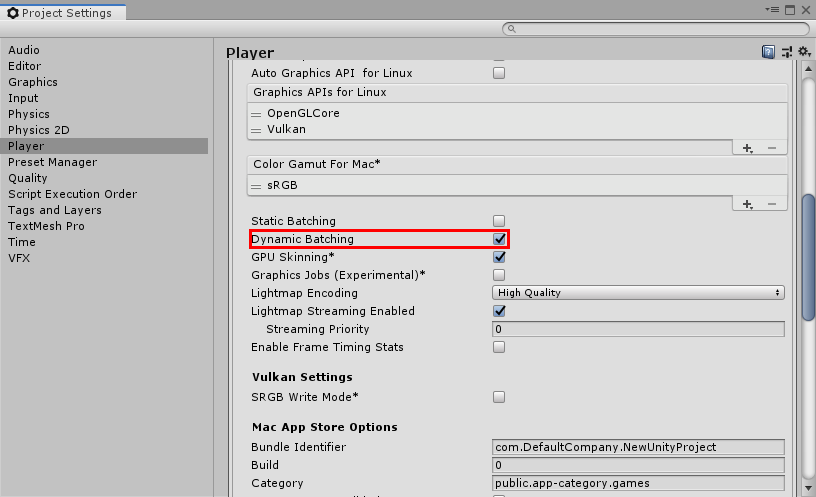 1)유니티에서 다이나믹 배칭은 기본적으로 비활성화되어있다. 이 기능을 사용하려면 project settings에서 player의 other settings에서 dynamic batching에 체크한다.
