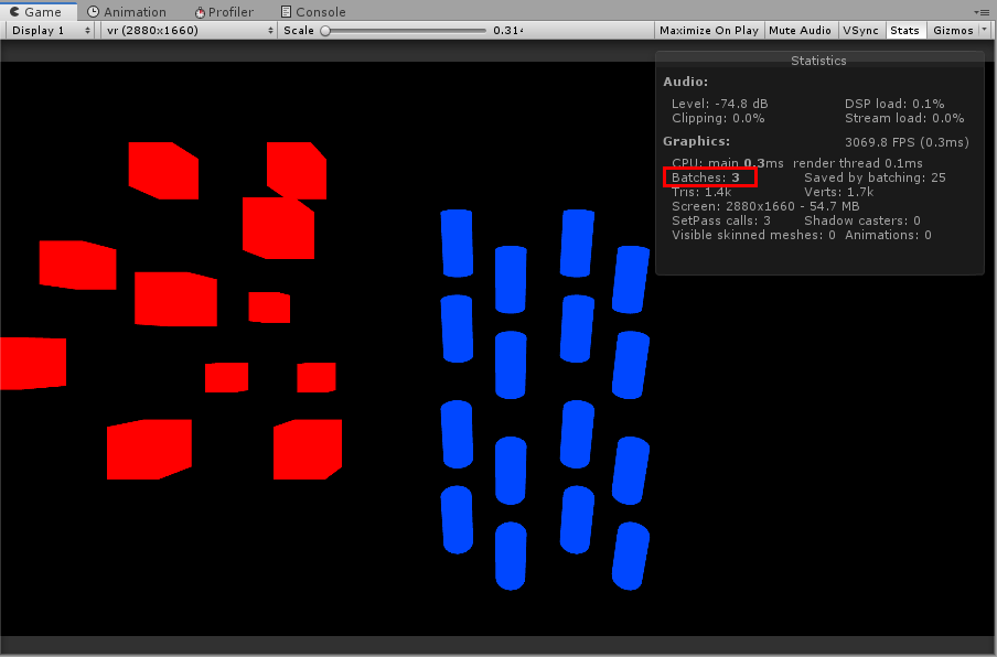 3)동일한 재질을 사용하는 실린더 오브젝트를 추가하였다. 실린더 오브젝트는 300개 미만의 정점을 가지기때문에 동적 배칭의 대상이다.