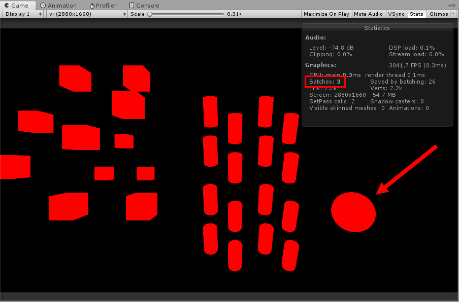 4)sphere 오브젝트를 추가하면 batches의 개수가 증가한다. 정점의 개수가 300개를 초과하여 동적배칭의 대상이 아니다.