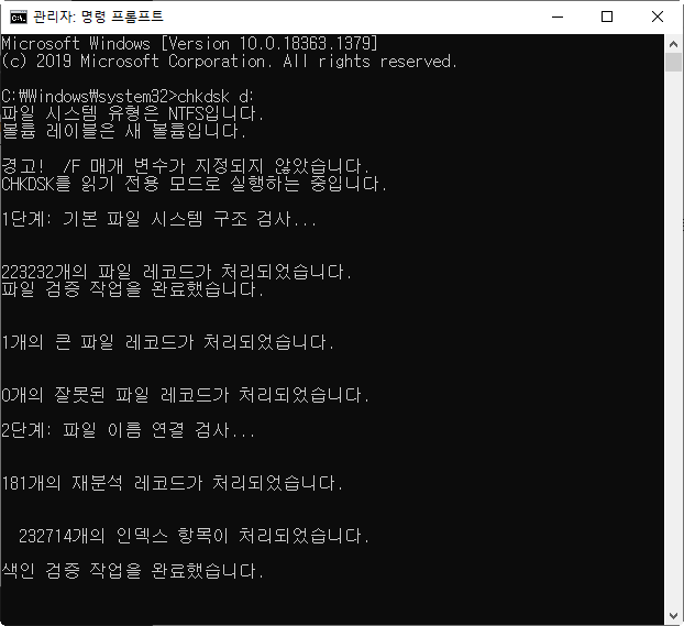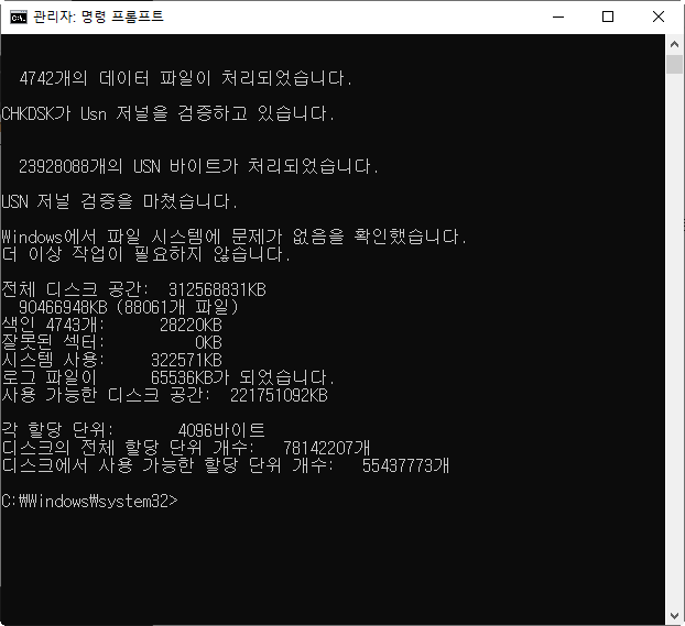 윈도우에서 chkdsk로 볼륨의 상태 확인하기(디스크검사)