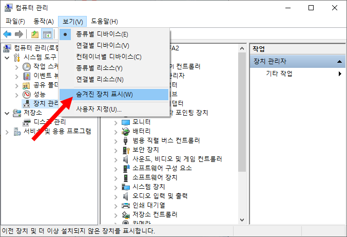 2)상단의 보기 메뉴에서 숨겨진 장치 표시를 선택한다.